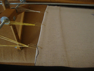 Так же видно, как я натягиваю канву по бокам))) Это не единственный способ. Можно использовать также прищепки для штор, а вместо резинок тесьму... В общем, вариаций много, а фантазии нам не занимать...))))